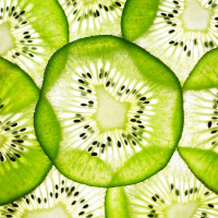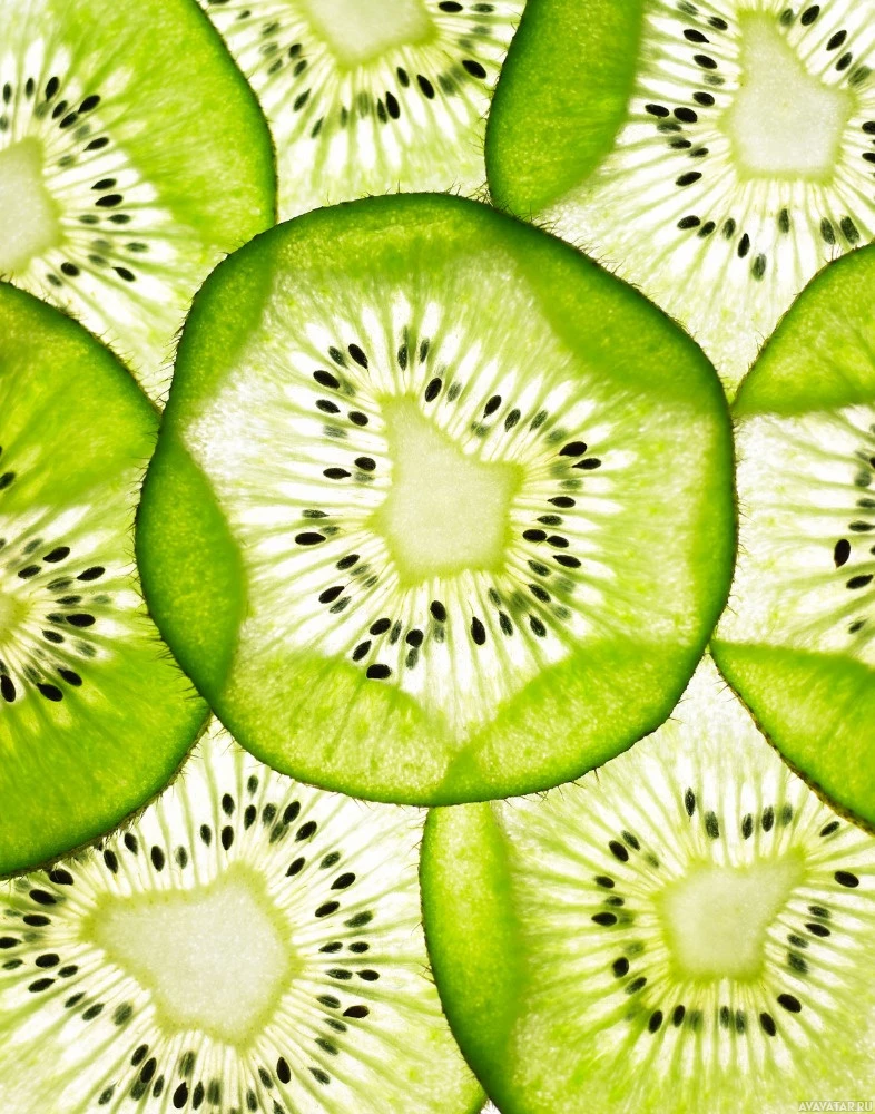 На картинке крупным планом изображен узор из кусочков киви. Каждый ломтик разрезан пополам, открывая сочную мякоть с характерными для киви мелкими черными семечками в центре. Этот фрукт невозможно спутать ни с чем другим из-за его необычной формы и цвета.