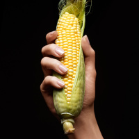 The image shows a person's hand holding an ear of corn, or maize, which is a type of vegetable. The focus is on the hand and the cob of corn, with the background being blurred, drawing attention to the main subject.