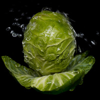 This image shows a piece of cabbage being washed with water. The cabbage is green and appears to be freshly rinsed, as evidenced by the water droplets falling on it.