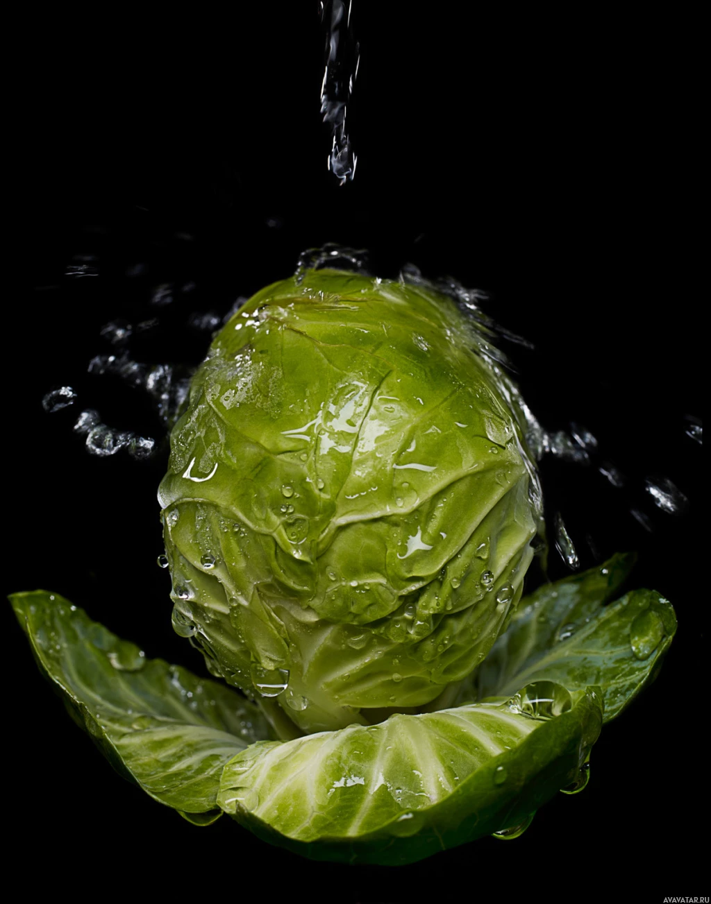 На этом снимке показан кусок капусты, промытый водой. Капуста зеленая и, по-видимому, только что промытая, о чем свидетельствуют капли воды, падающие на нее.