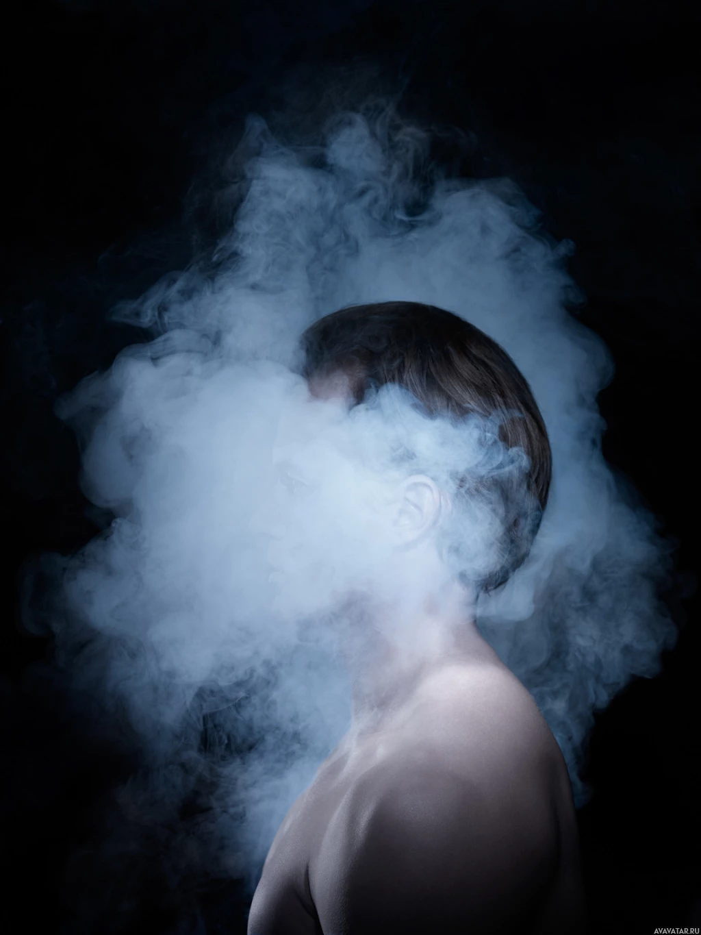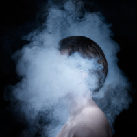 a backdrop of smoke or steam, which creates an illusion as if the person's head is disappearing into the cloud. It appears to be a creative and possibly symbolic photograph capturing a moment where the individual seems to be immersed in or blending with the surrounding atmosphere. The use of this effect emphasizes