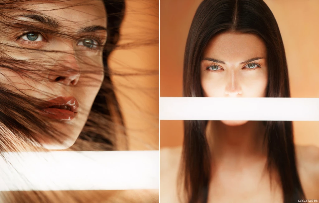The image is a side-by-side comparison of two photographs of the same individual. On the left, the woman appears to have her hair blowing in the wind with