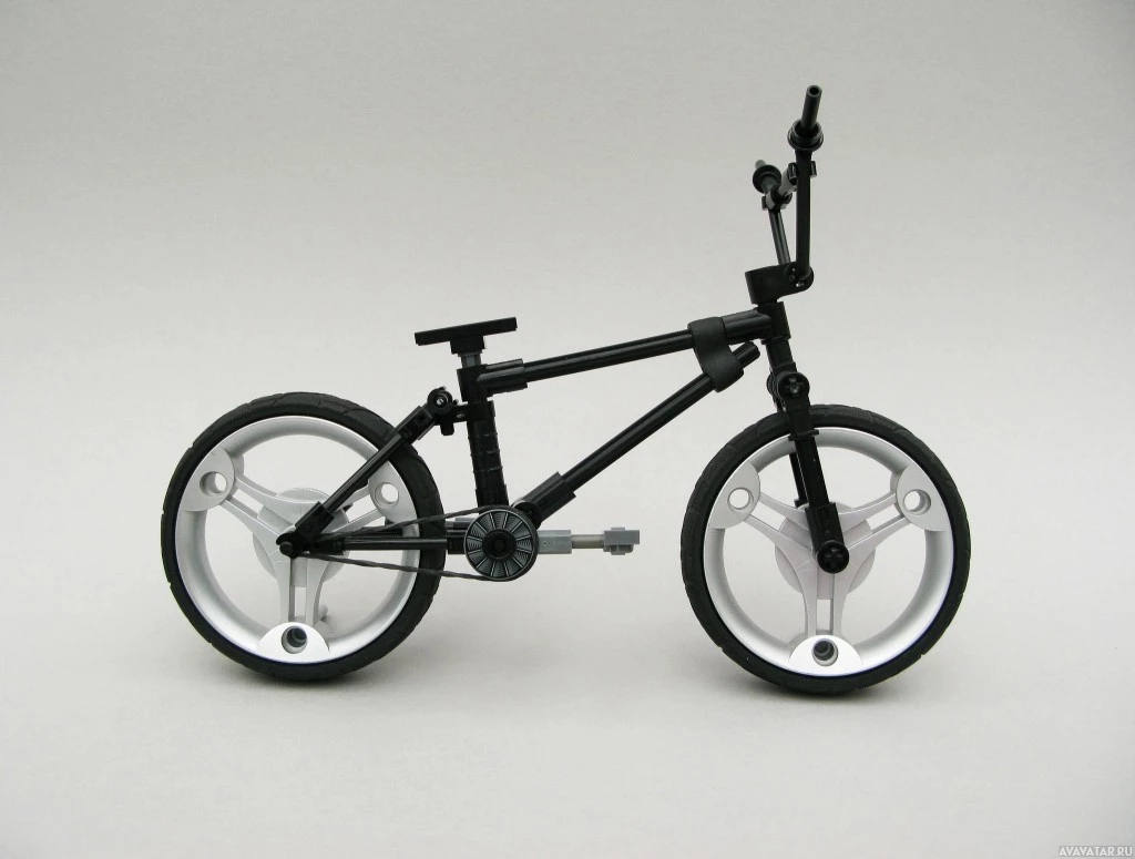 На фотографии изображен велосипед Lego. Это модель велосипеда, вероятно, разработанная, чтобы напоминать типичный односкоростной или складной велосипед с небольшой колесной базой, подходящий для маленьких детей, чтобы играть и наслаждаться строительством.