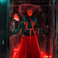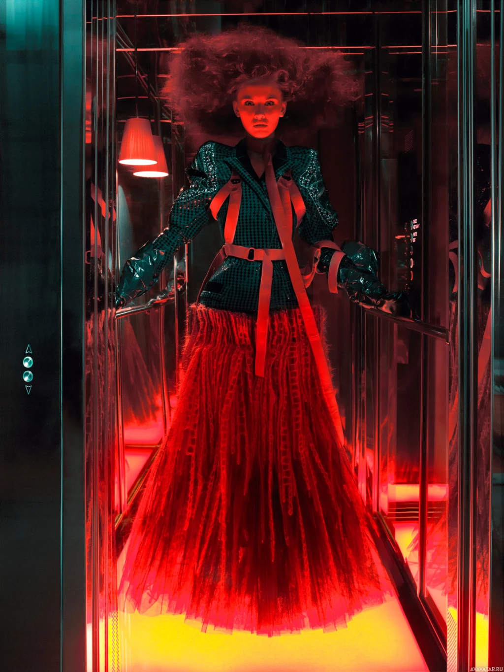 red lights illuminating the person from below, which might be part of the design for the elevator itself, giving it a unique and stylish look.