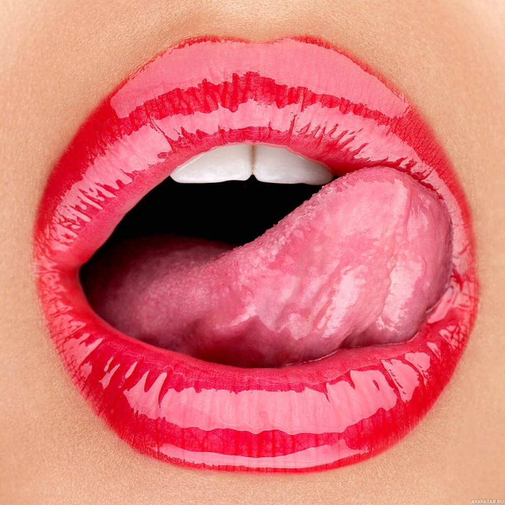 На картинке крупным планом изображен человеческий рот с приоткрытыми в улыбке губами и высунутым языком. Это распространенный способ передать приветливое, игривое или соблазнительное настроение.