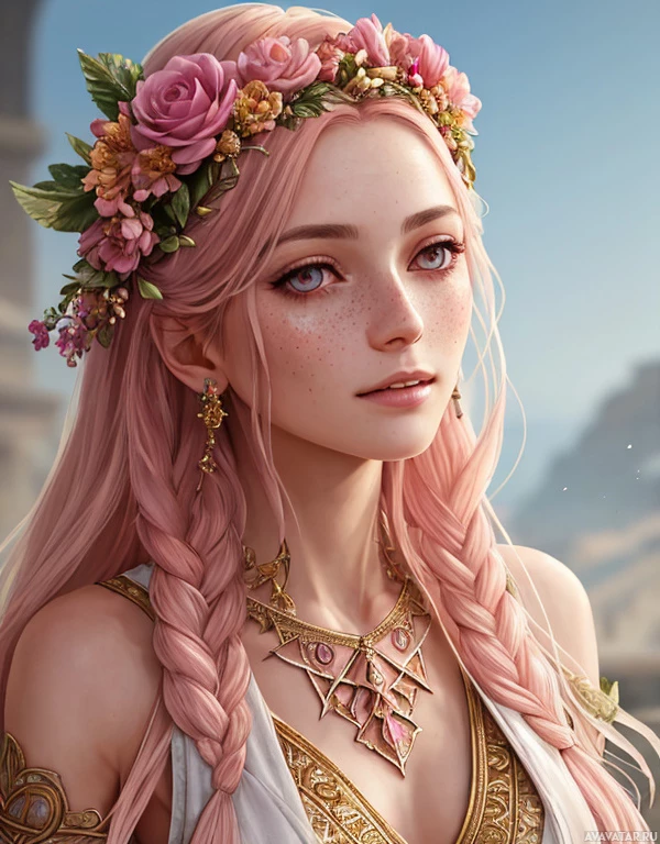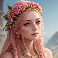 female character with pink hair and a floral crown or headband adorned with flowers. She has striking
