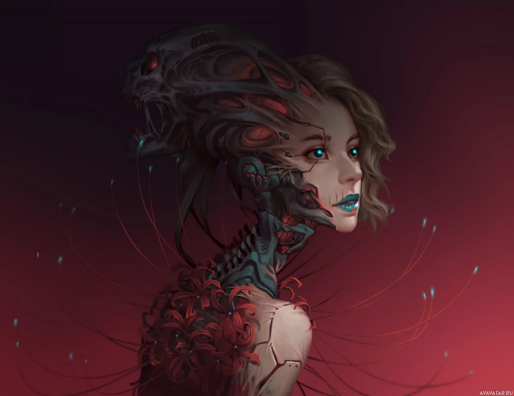 science fiction and horror elements, often referred to in art and media as "biomechanical" or "biotech." This type of artwork is common in genres like cyberpunk, dark fantasy, and post-apocalyptic narratives. The character's design could be interpreted as a fusion of humanity with technology, potentially exploring themes such as the consequences of advanced artificial intelligence or the integration of biological and machine entities.