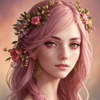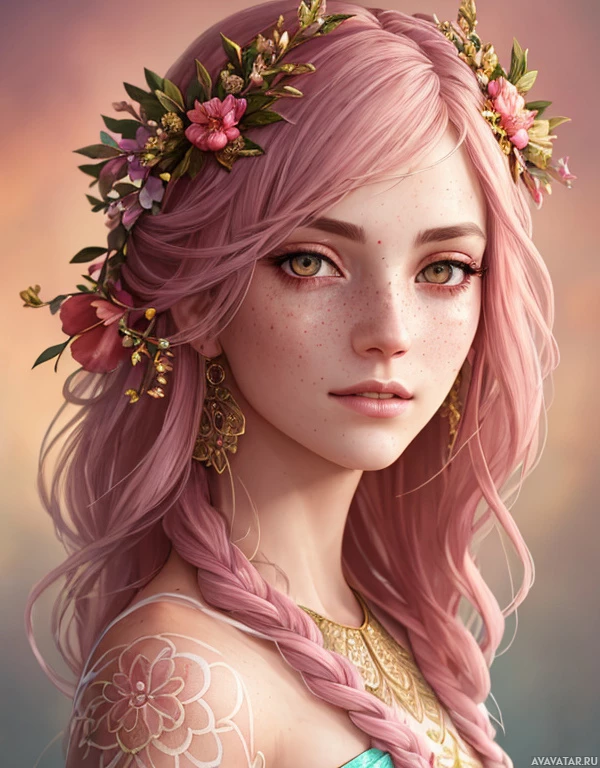 a young woman with pink hair. She is adorned with flowers, possibly suggesting she's attending a special event or simply being depicted in