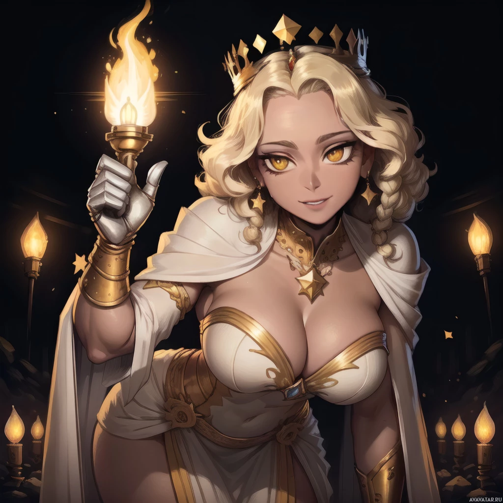 a female figure with blonde hair, wearing what appears to be royal or fantasy-inspired attire, including armor and a crown. She's holding up a torch, which suggests she may have