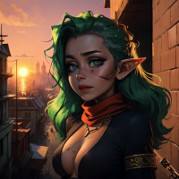 green hair and is wearing what looks like armor or clothing with a fantasy theme. The setting suggests a cityscape during either dawn or dusk, as the sun is low in the sky. In the background, there are buildings and a river, which could indicate that this scene takes