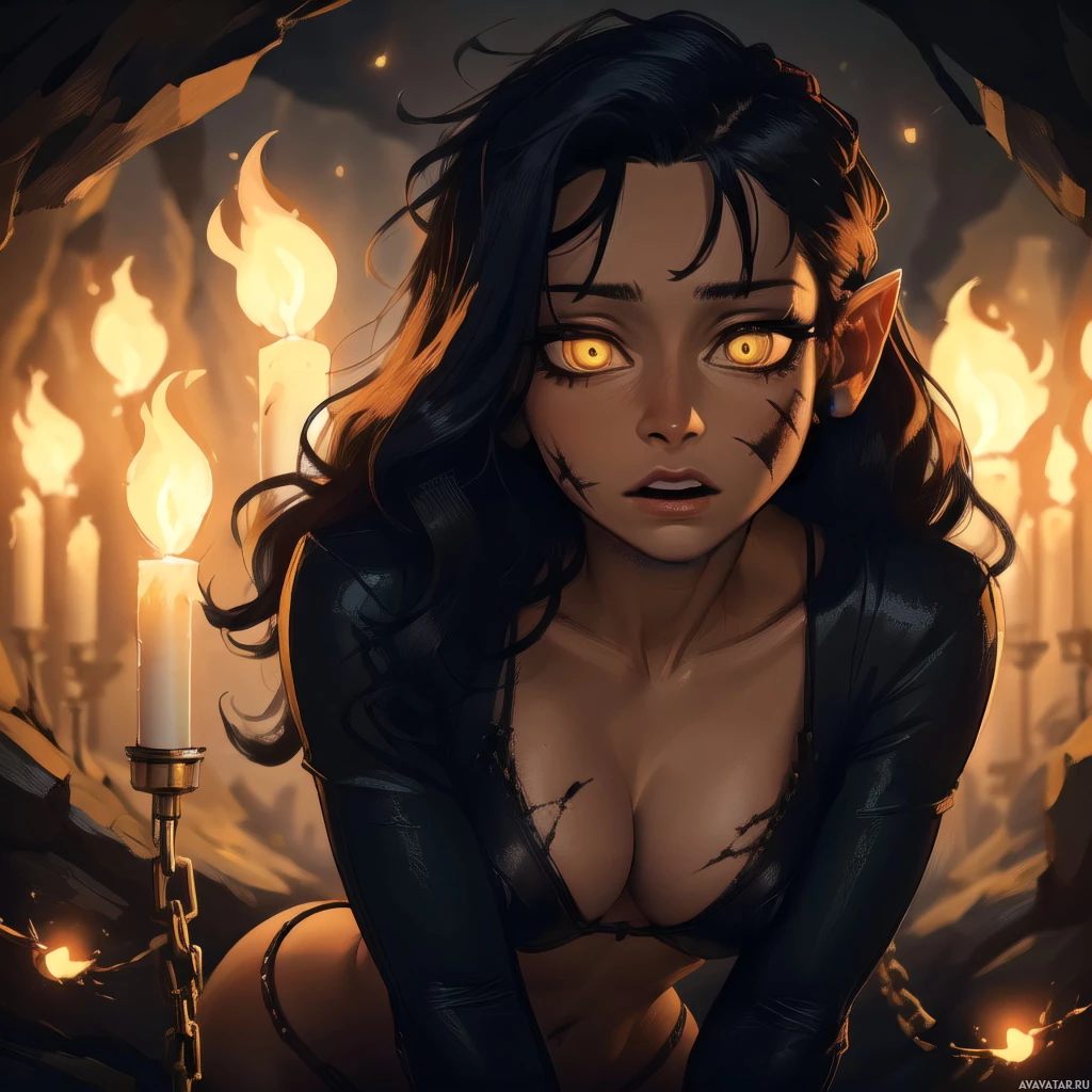 a dramatic pose, with a dark and moody setting featuring candles or torches that cast ominous light. Her expression is somewhat concerned or contemplative. The use of such elements as the flickering flames and the character's attire suggest a scene from