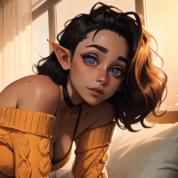 pointed ears. The character in the foreground is wearing a yellow sweater and seems to be looking down or away from the camera with a slightly