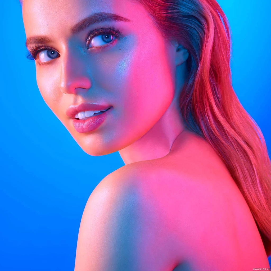 lipstick in a shade that complements the lighting. The background has a gradient transitioning from blue to pink, creating a soft