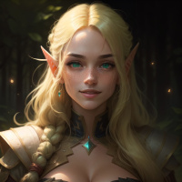 blonde hair with blue highlights and pointed ears indicative of an elven race. She is wearing armor and holding a sword, suggesting she may be a warrior or a guardian