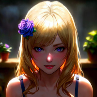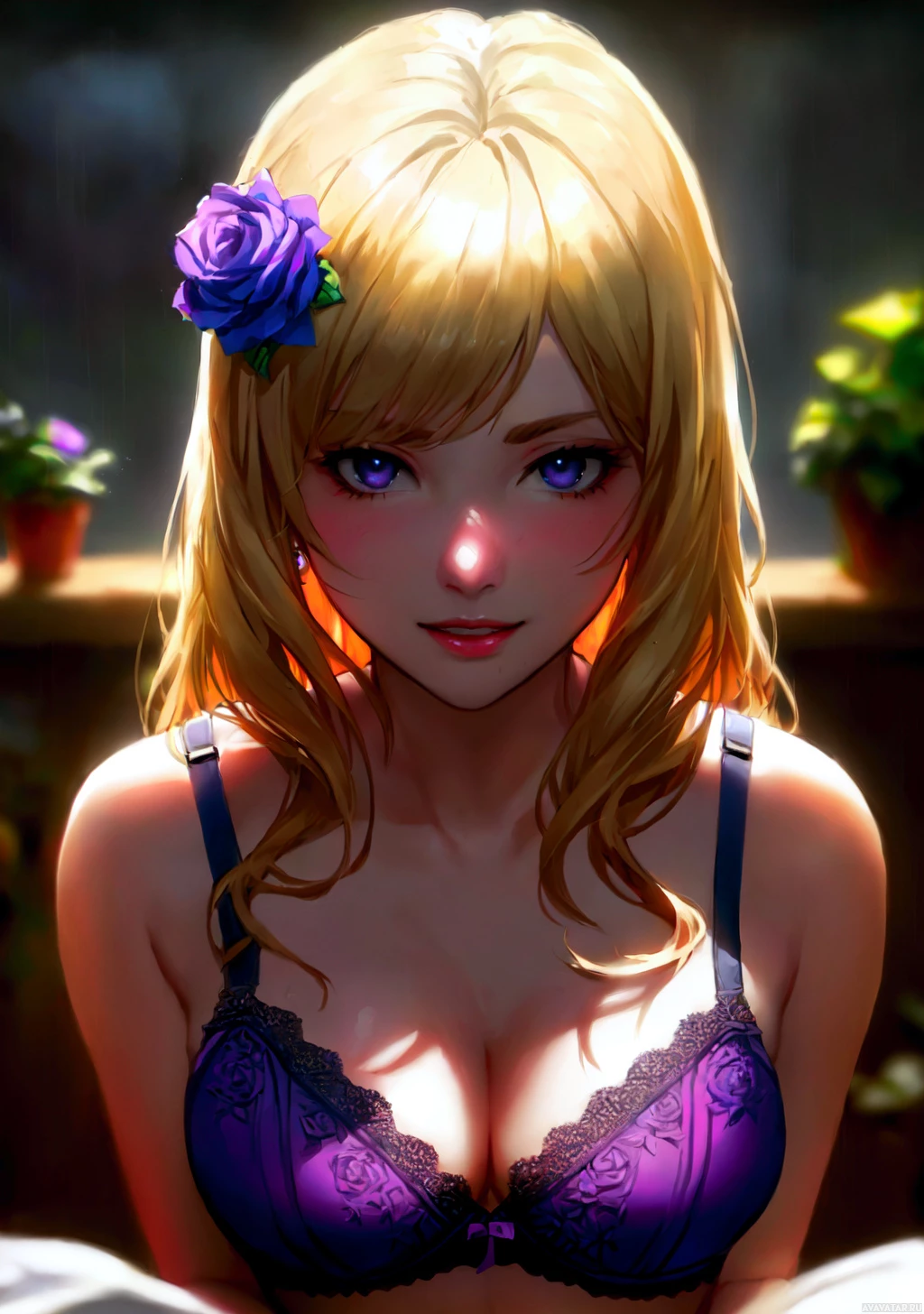 a light complexion and is wearing purple lingerie, including a bra and underwear. Her expression appears to be one of curiosity or intrigue. The background suggests a nighttime setting with a hint of rain, as indicated by