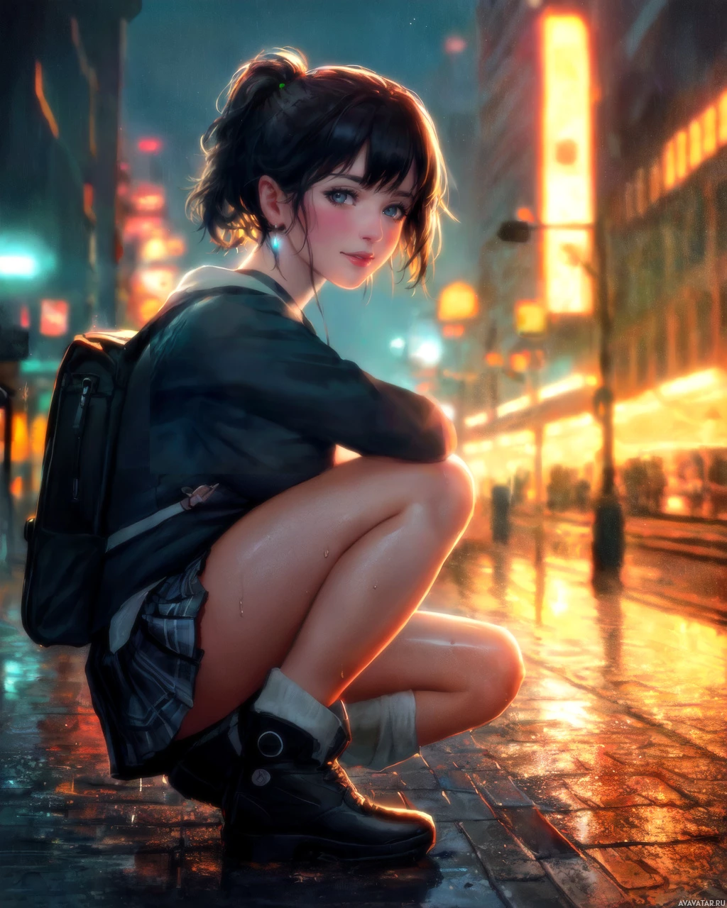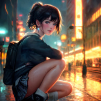 На картинке изображен персонаж, который выглядит как молодая темноволосая женщина. На ней надет рюкзак, и она сидит на улице ночью. На заднем плане изображен городской пейзаж, включающий светящиеся вывески и мокрый тротуар, что говорит о том, что недавно прошел дождь. Общая атмосфера картины меланхолична или погружена в себя.