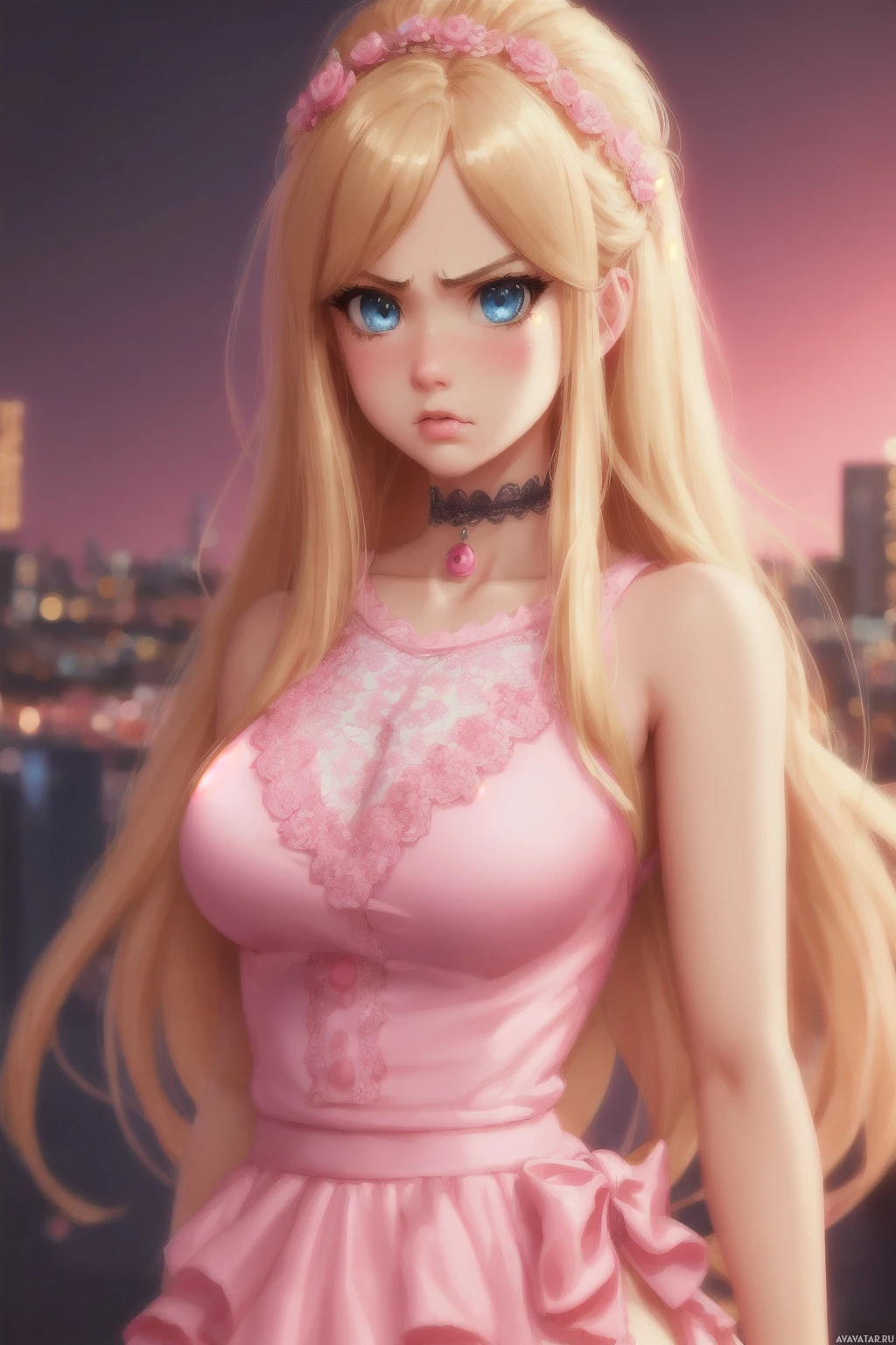 На картинке изображен персонаж, который выглядит как девушка со светлыми волосами. На ней розовое платье, а на лице удивленное или шокированное выражение.