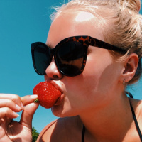 The image shows a woman enjoying a strawberry. She is wearing sunglasses, suggesting it might be a sunny day. She has blonde hair and appears to be at the beach or near a body of water, given the sandy area visible in the background.