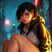 a contemplative expression on her face and is looking directly at the viewer. The background suggests a futuristic or dystopian urban setting with neon lights, which is common in