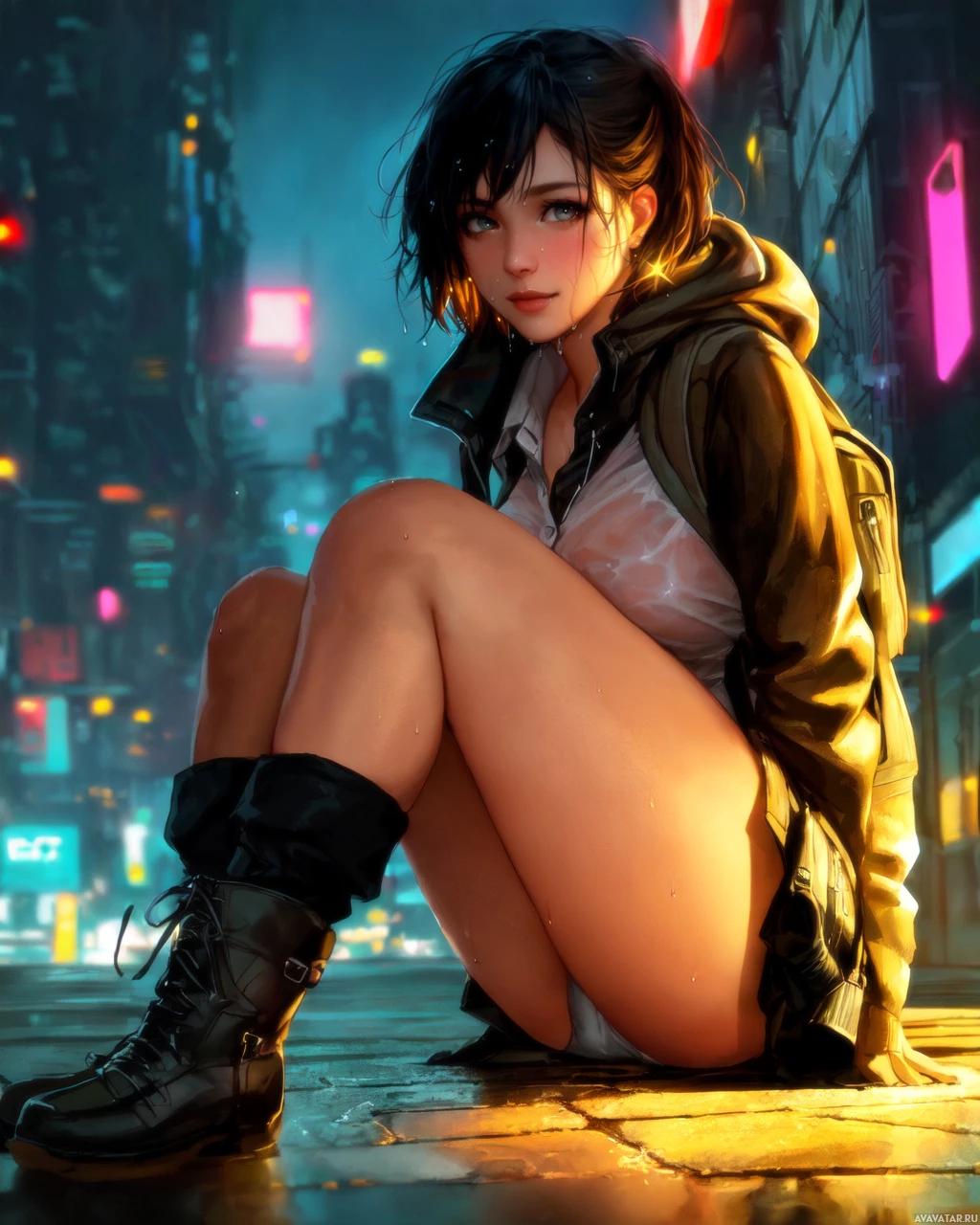 dark hair, is wearing a black jacket and boots, and is sitting on what appears to be a wet street. She has