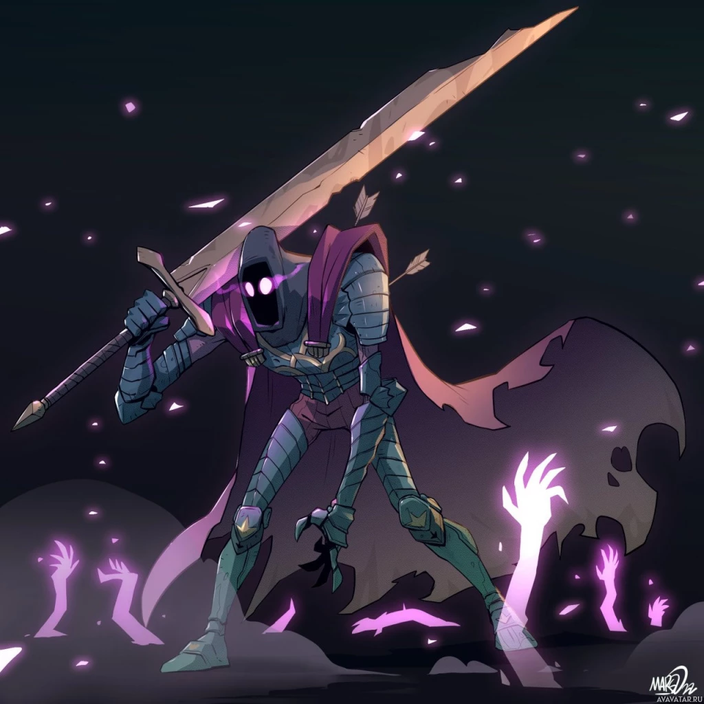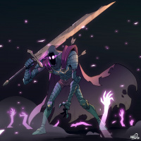 a purple glow around them, suggesting they may have some sort of magical or powerful status within the context of this story or game. They are dressed in armor with a cape flowing behind them, which gives an impression of movement or
