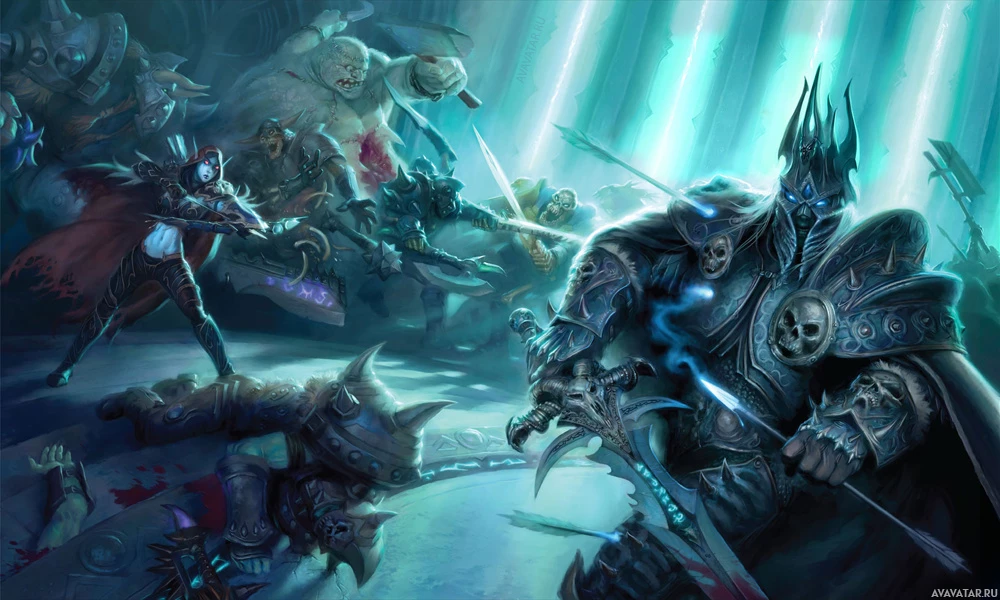 a Lich King, known as Arthas Menethil in the game's narrative. Surrounding him are several other figures, some of which appear to be undead or affected by his presence. The setting looks like it could be within