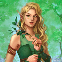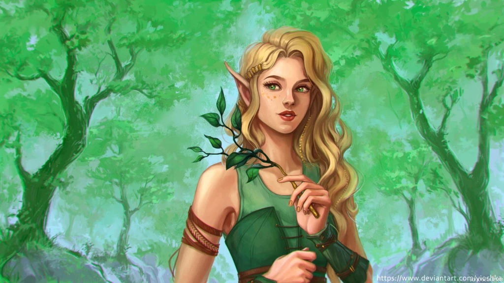 blonde hair, pointed ears typical of elves in fantasy genres, and is dressed in what appears to be a traditional elven outfit with a leaf adorned on her shoulder. Her expression is calm and she seems to be in the midst of