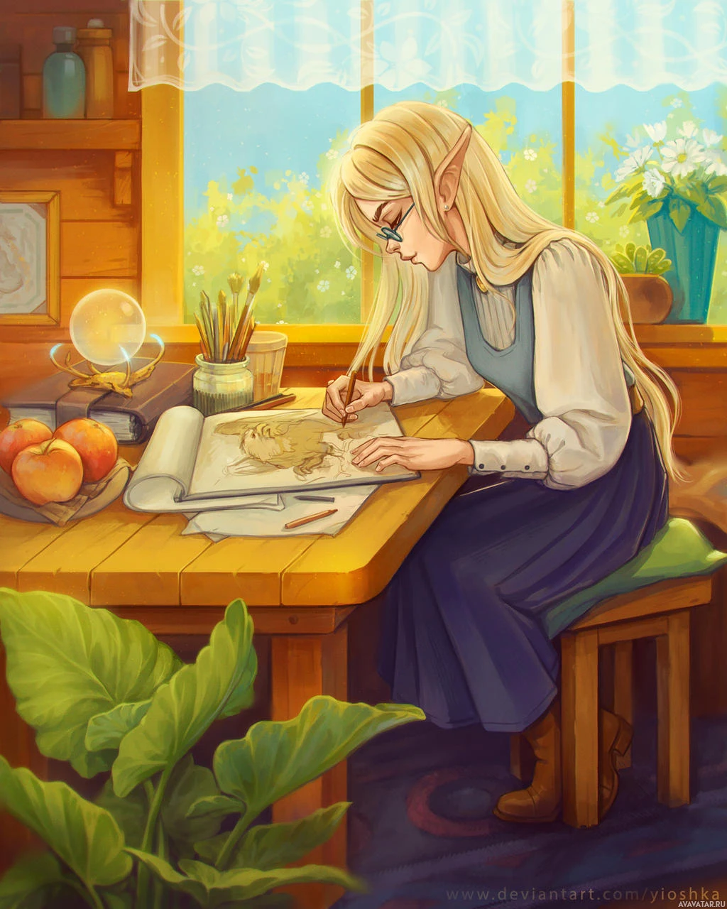 blonde hair, which contributes to their elven appearance. The background appears to be a cozy