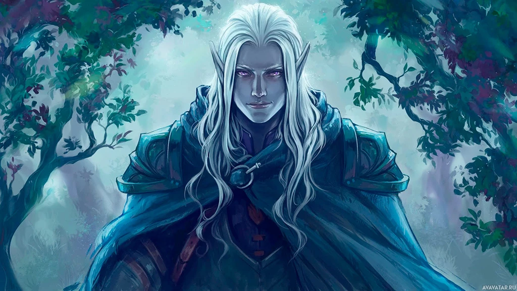 white hair and pointed ears, wearing robes that are typical of elven attire in fantasy settings. Behind the character, there are