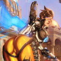 a female character from the video game "Overwatch." The character depicted is Tracer, known for her