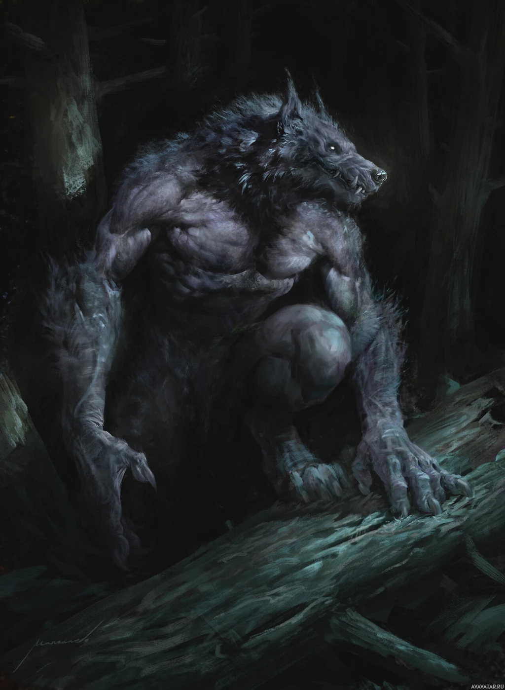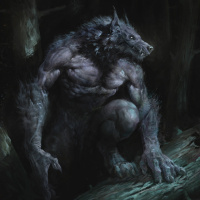 a forest setting that appears to be dark and somewhat eerie. It has the typical features associated with werewolves, such as