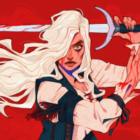 The image shows a character with white hair, holding a sword. She appears to be wearing some kind of armor or clothing that might be associated with a fantasy setting or role-playing game. There's a stylized artistic quality to the illustration.