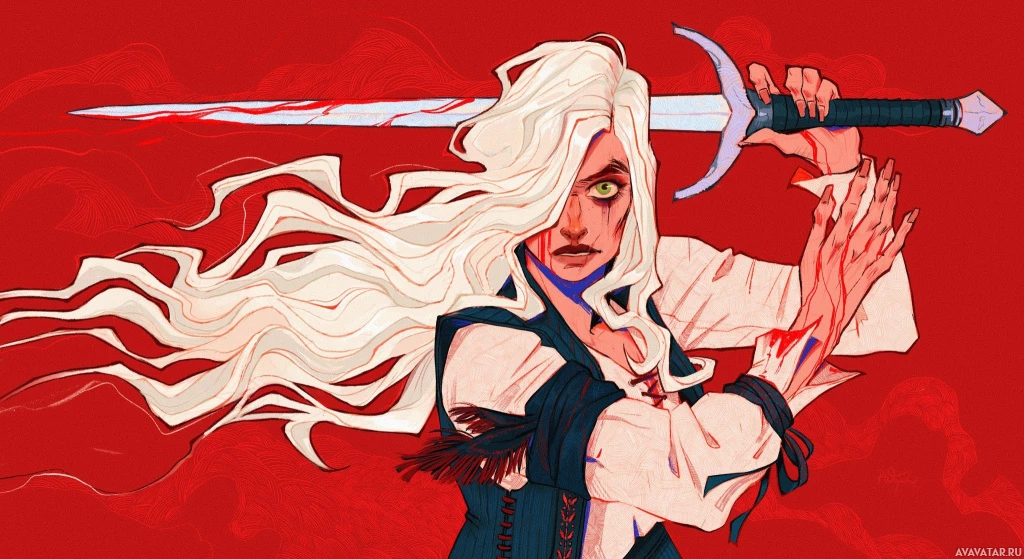 На картинке изображен персонаж с белыми волосами, держащий меч. Кажется, что на ней надеты какие-то доспехи или одежда, которые могут ассоциироваться с фэнтезийным сюжетом или ролевой игрой. Иллюстрация стилизована под художественное произведение.