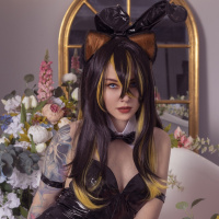 a black corset with a prominent rabbit ears headpiece, which is commonly associated with the character "Madame Lalonde" from the game "Persona 5." Additionally, the individual has