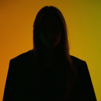 The picture shows a silhouette of a person standing in front of a gradient background that transitions from yellow to green and then to blue. The individual appears to be a woman with long hair, based on the visible silhouette. This image may have been taken as part of a creative project or advertisement due to its artistic composition.