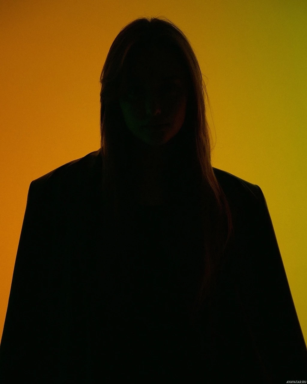 На картинке изображен силуэт человека, стоящего на фоне градиентного фона, который переходит от желтого к зеленому, а затем к синему. Судя по видимому силуэту, это женщина с длинными волосами. Возможно, это изображение было сделано в рамках творческого проекта или рекламы из-за его художественной композиции.