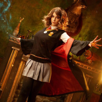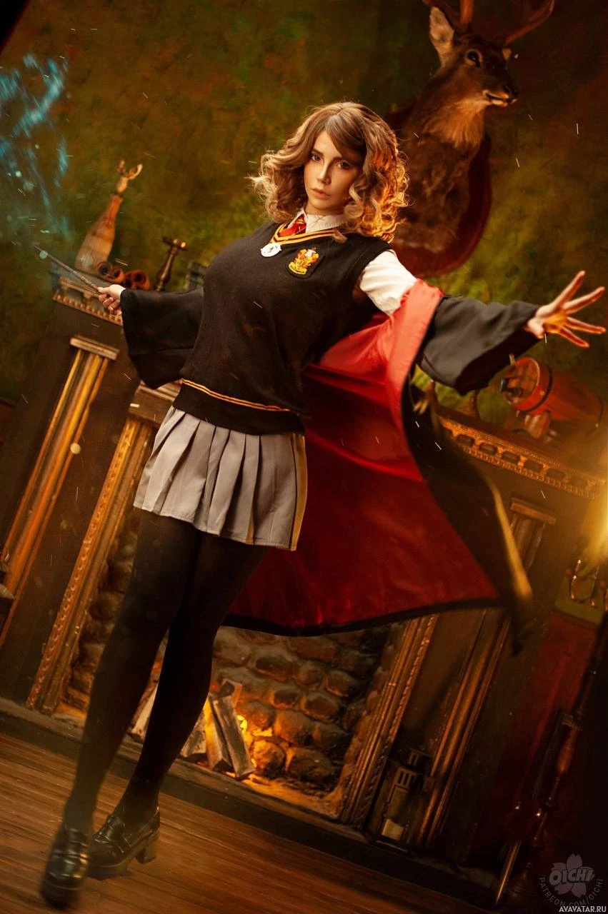 The image features a person dressed as Hermione Granger from