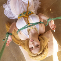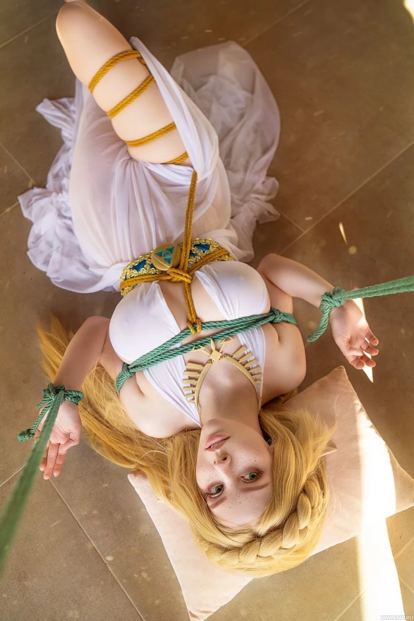 The image shows a woman lying on her back wearing a costume that resembles the attire of Princess Zelda from the "Legend of Zelda" video