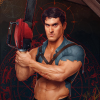 an illustrated character who appears to be a man in a muscular build. He is shirtless, displaying well-defined abs and arms, suggesting he might be depicted as a heroic or