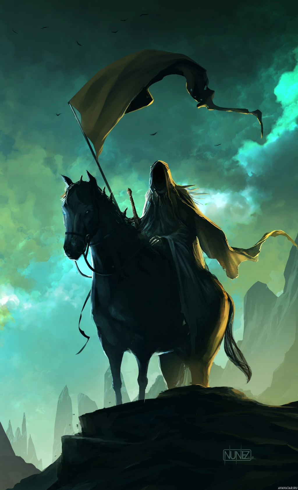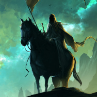 The image depicts a fantasy-themed scene. A person, who appears to be a knight or warrior due to their armor and the sword they hold in one hand while riding a horse with the other. The figure is silhouetted against