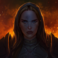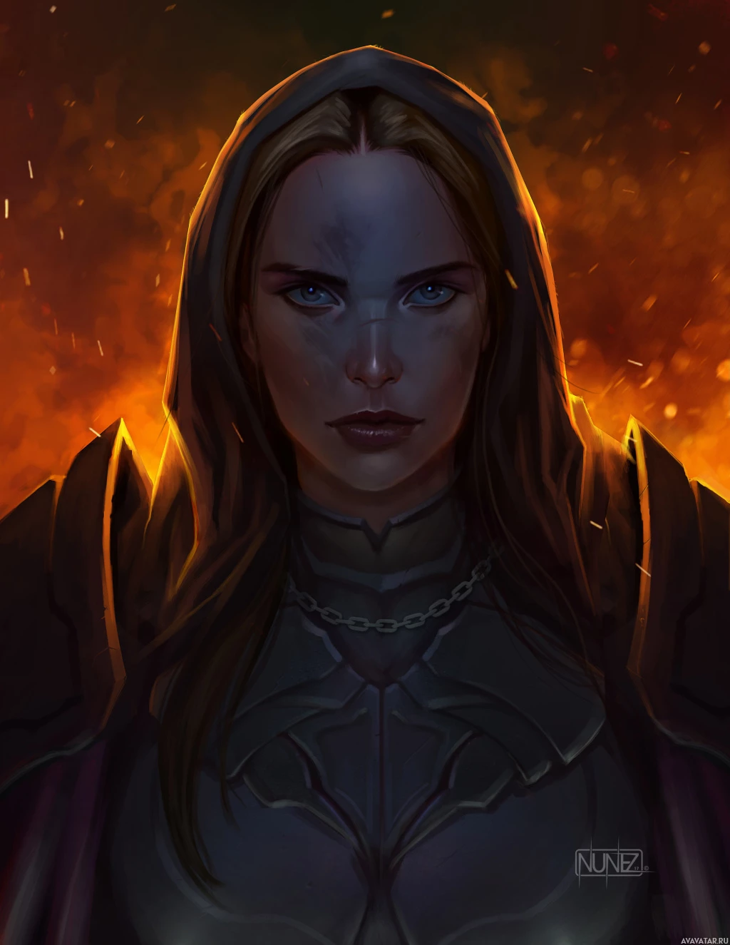 На картинке изображен персонаж женского пола с голубыми глазами и светлыми волосами, одетый в доспехи, что наводит на мысль о том, что она может быть воином или рыцарем. Ее лицо частично скрыто капюшоном, который надвинут на голову, чтобы показать ее черты. Задний план создает впечатление пылающего поля боя, что, возможно, указывает на ее роль в сражении или приключении.