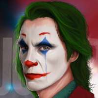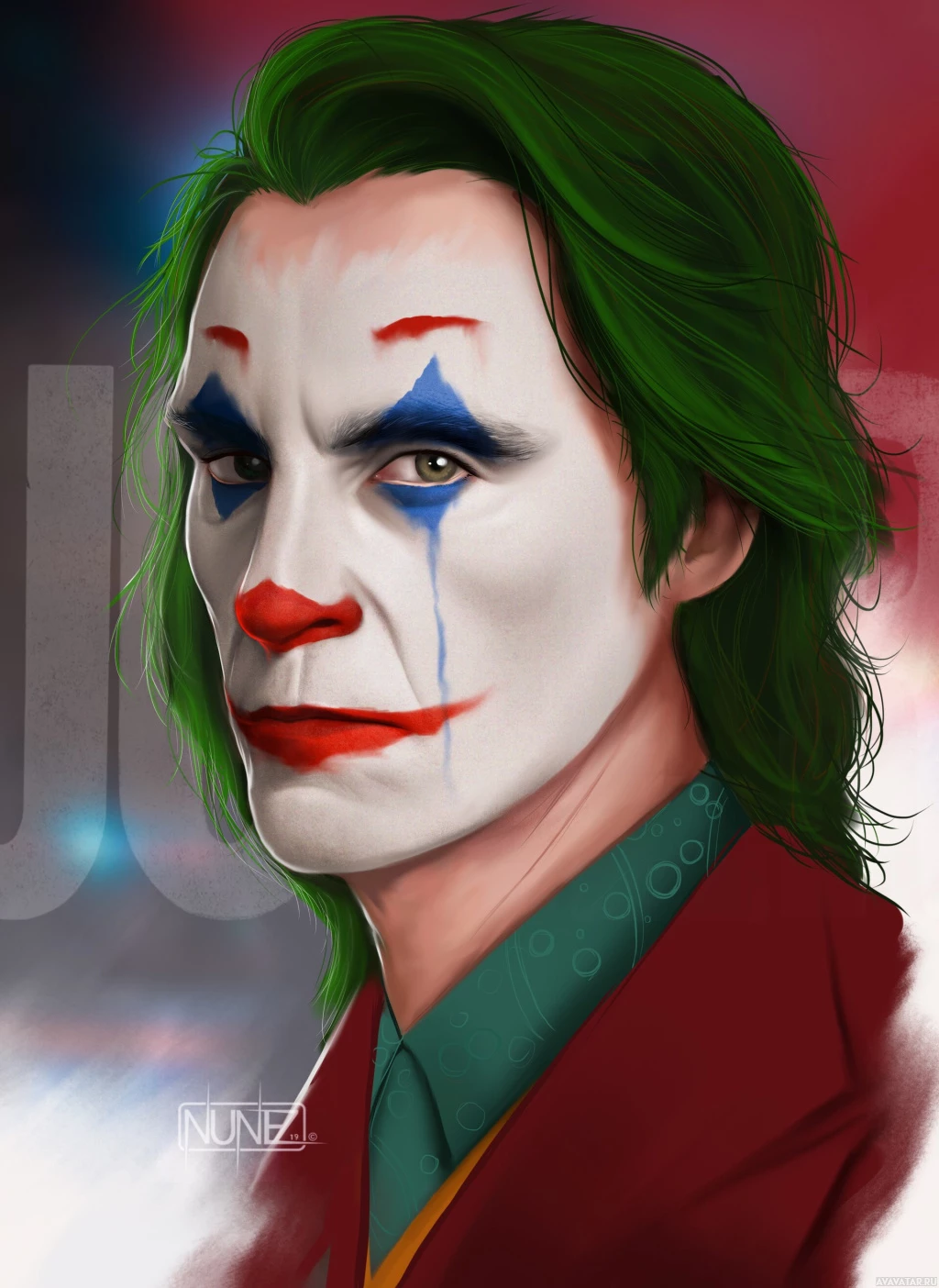The image features a stylized, artistic illustration of the character known as the Joker from