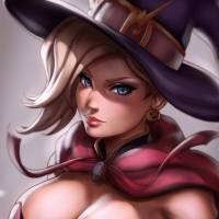 The image shows an illustration of a female character. She is wearing a witch-themed outfit with a pointed hat, and she appears to be from the "League of Legends" series given the style and attire. Her expression seems contemplative or serious, and she has blonde hair.