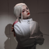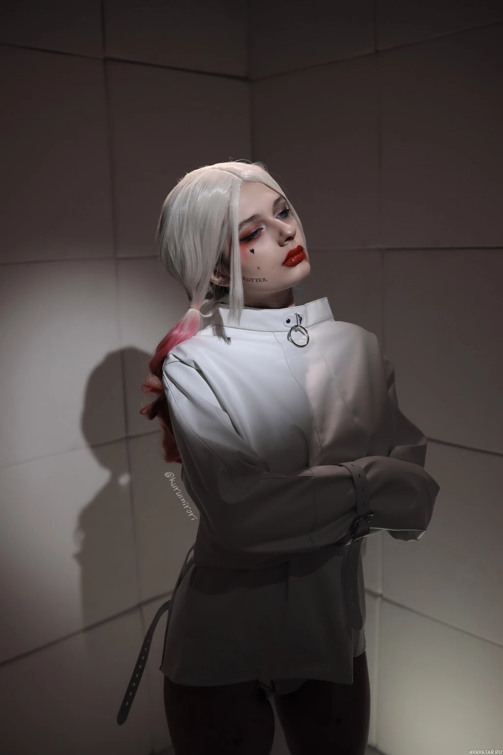 The image shows a person dressed in a white jacket and a blonde wig, with a pale complexion that resembles the character