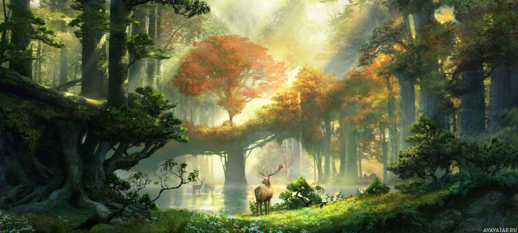 various species of flora and fauna. The overall atmosphere suggests tranquility and harmony with nature.