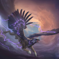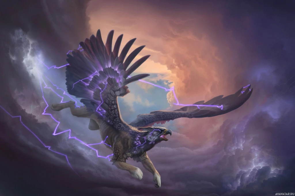 a mythical creature with the body of a lion and the head and wings of an eagle. In this fantasy-themed artwork, the griffon is shown soaring through the sky, with lightning striking near its head, suggesting a magical or powerful presence. The background features