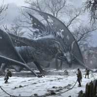 a fantasy scene where a group of people are gathered around a large, mythical-looking dragon. They appear to be interacting with the creature, suggesting it might be a tamed or friendly dragon rather than one that poses a threat. The setting is outdoors, possibly during winter given