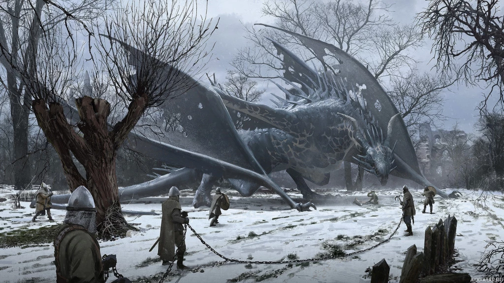 the snow on the ground and the attire of the people present. The dragon's scales have a reflective quality, and its tail is raised, indicating movement. The scene evokes a sense of adventure or exploration often associated with