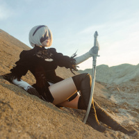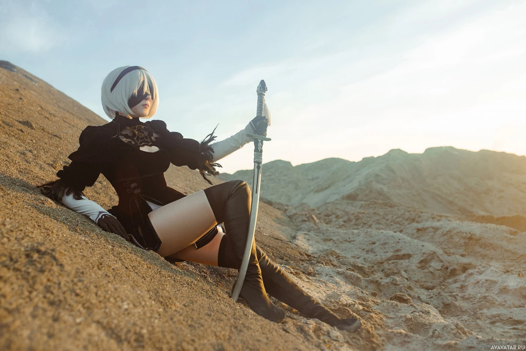 the video game "Nier: Automata." This character is typically associated with the series due to her distinctive appearance and weaponry. The setting appears to be