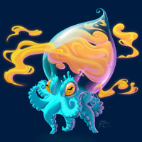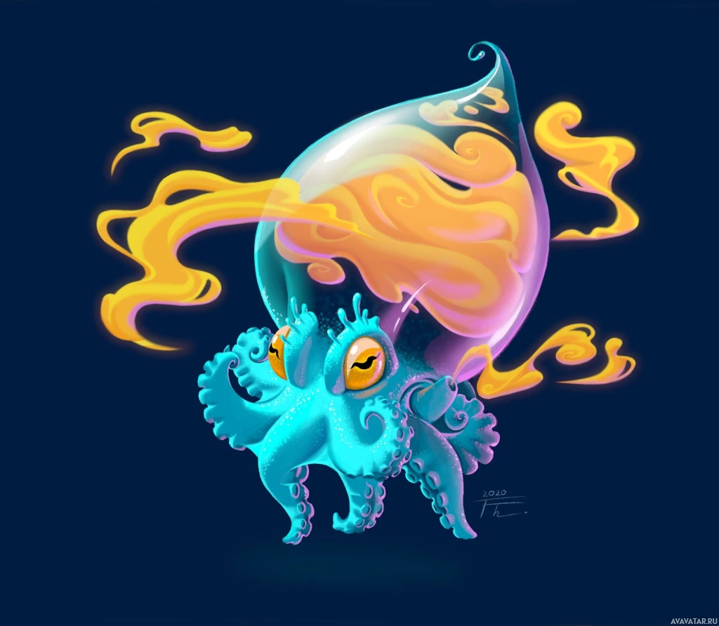 a playful expression. It has tentacles, which are typical of an octopus, but in this image, they are anthropomorphized with arms that look like those of a human. On its head, there is a flame or fire element, adding to the magical and whimsical